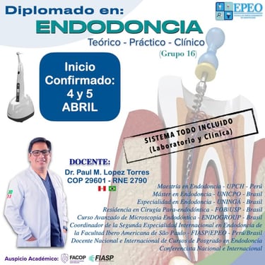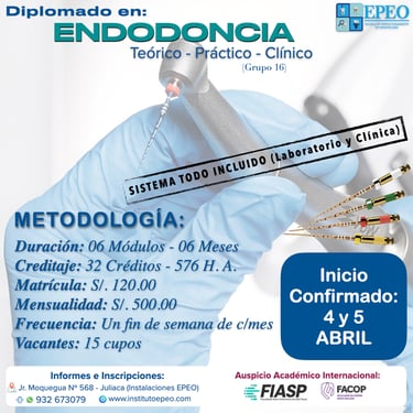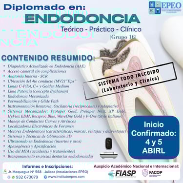 El Instituto de Perfeccionamiento en Odontología (EPEO) se complace en presentar su Diplomado en Endodoncia, una formación integral, actualizada y de alta exigencia académica, dirigida a cirujanos dentistas que buscan especializarse en terapias endodónticas modernas.